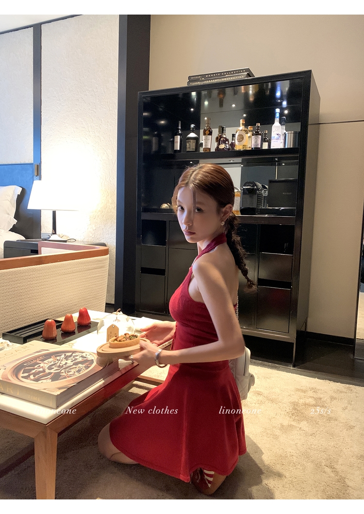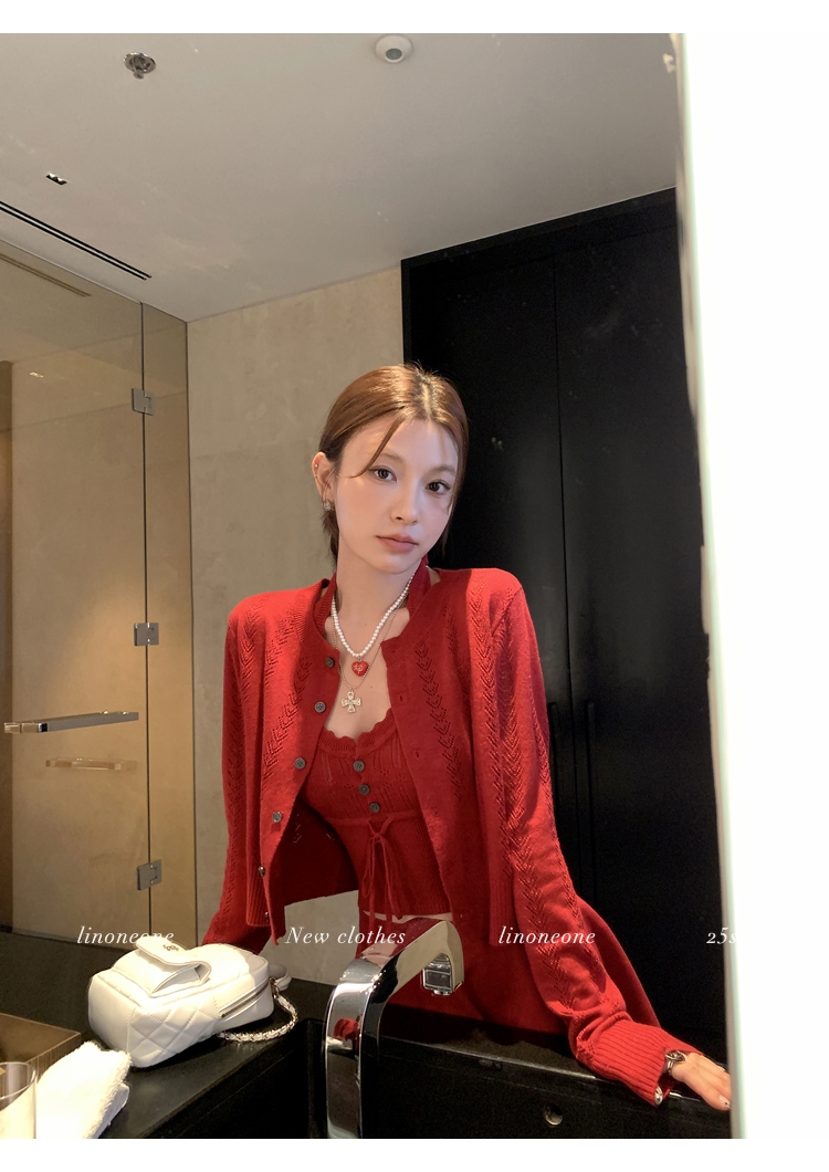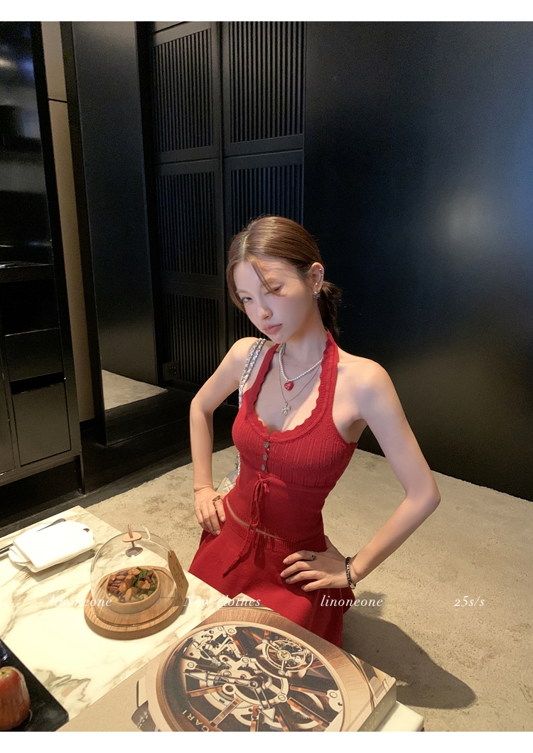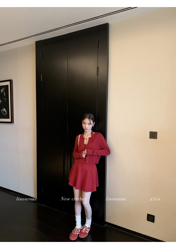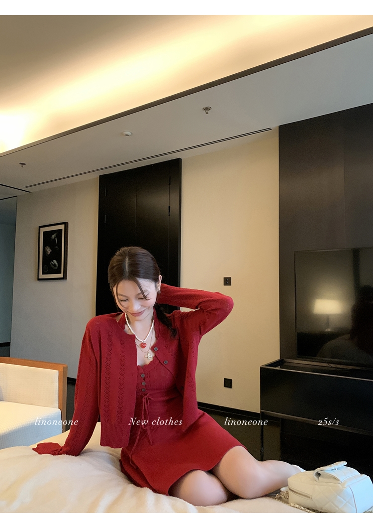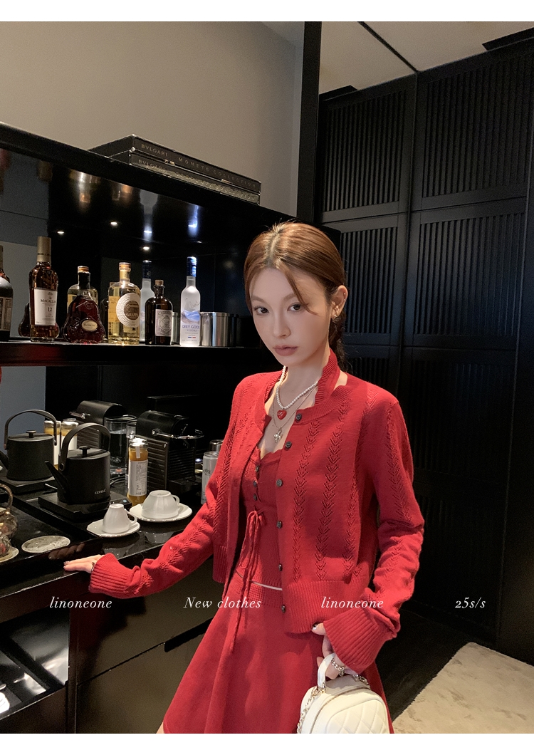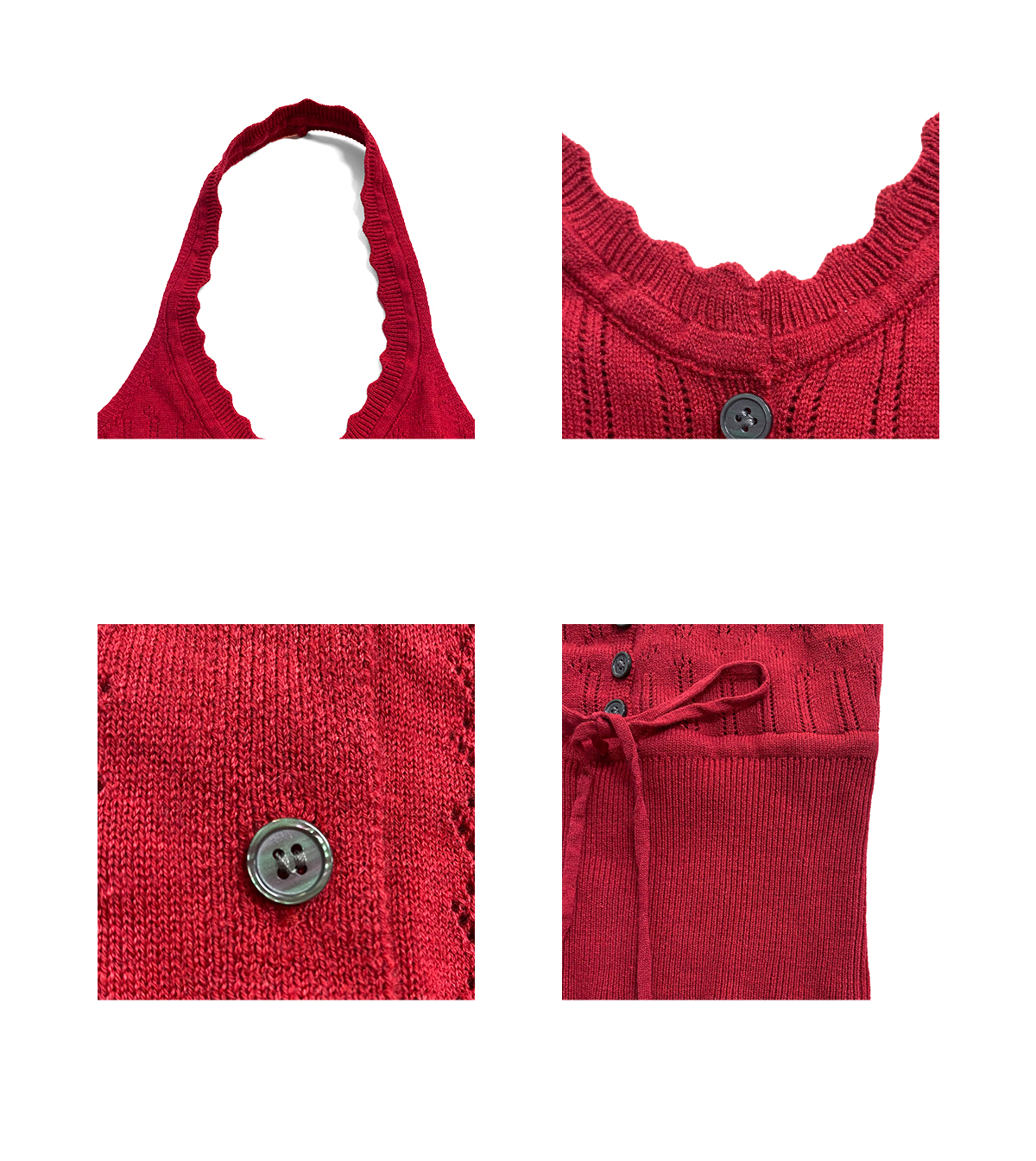 LIN red crocheted wool knitted cardigan / halterneck vest / skirt set