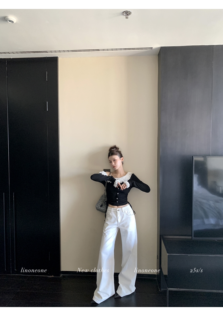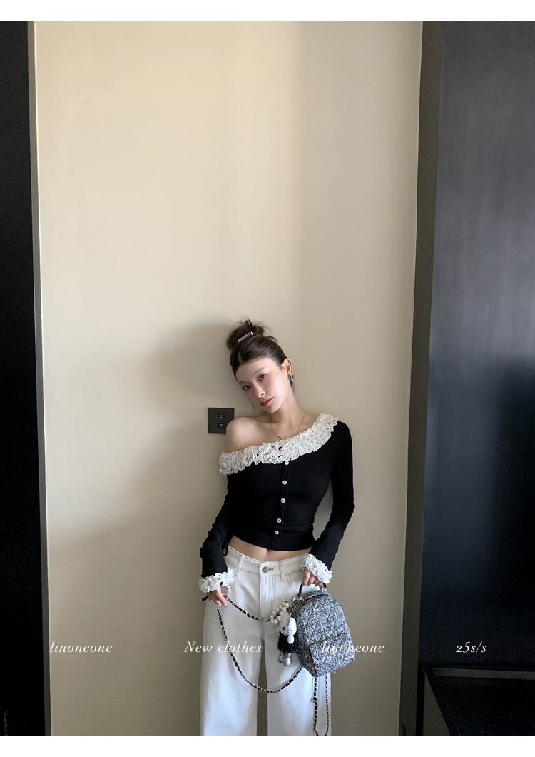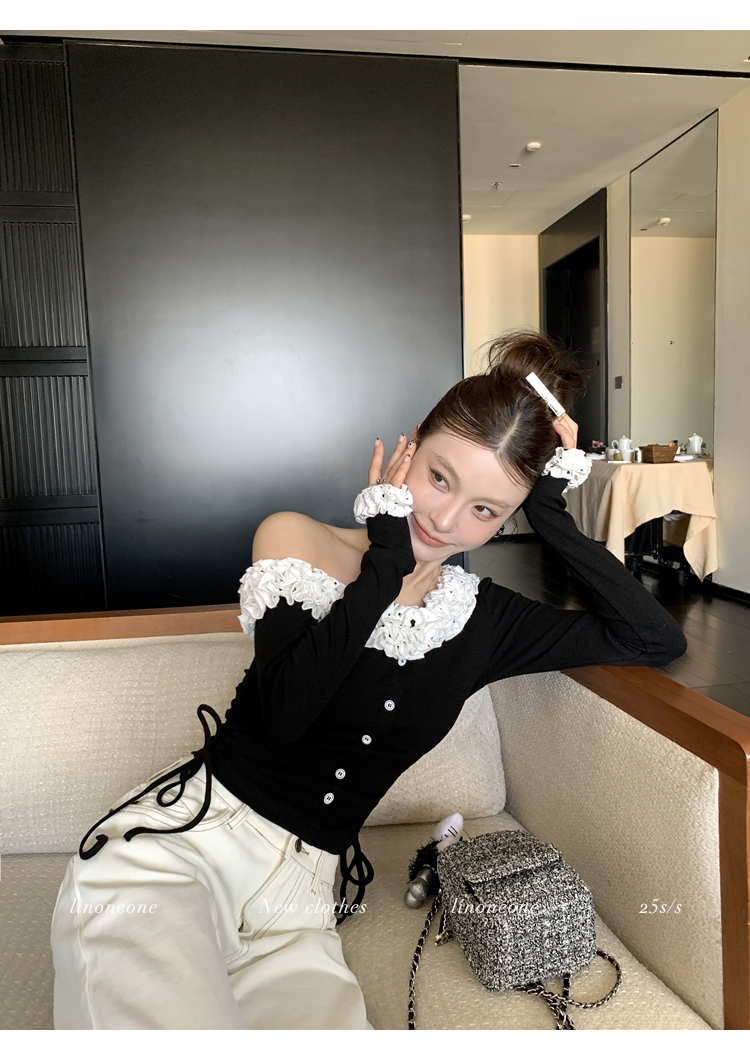 LIN Polka Dot Pleated Off-the-shoulder Slim Drawstring Knit T-shirt