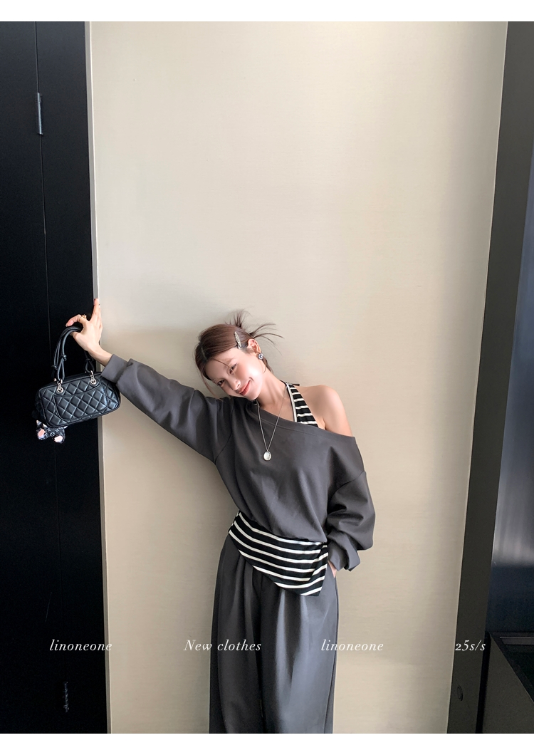 LIN casual loose striped gray oblique shoulder sweatshirt wide-leg pants set
