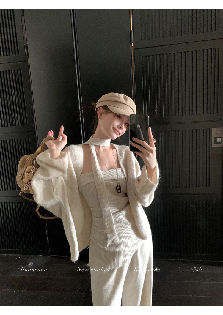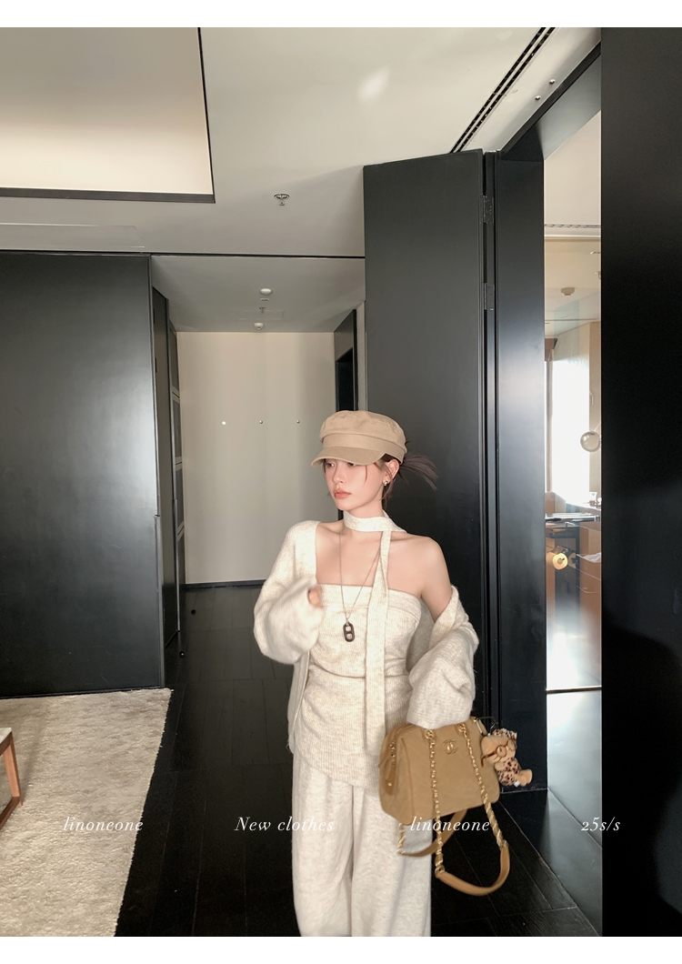 LIN knitted cardigan stretch slim knitted tube top casual pants three-piece set