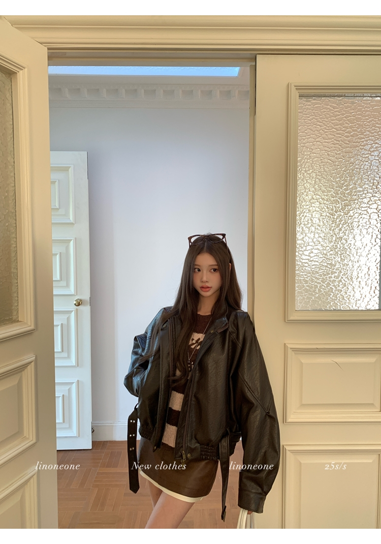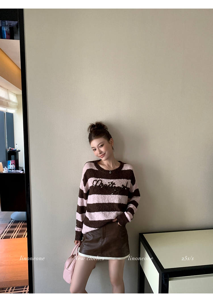 LIN Pink Brownie Coffee Striped Letter Lazy Loose Pullover Knit Sweater