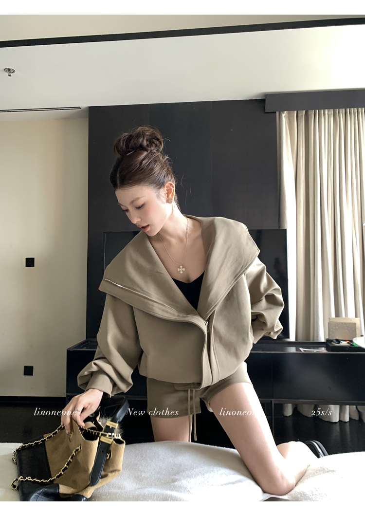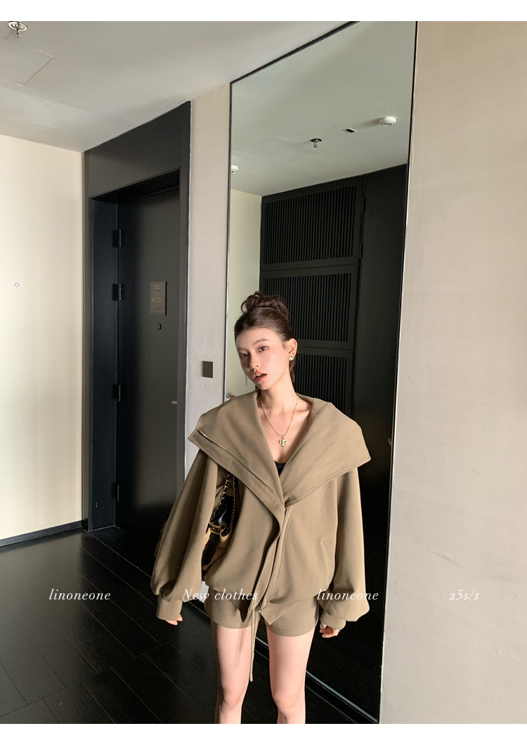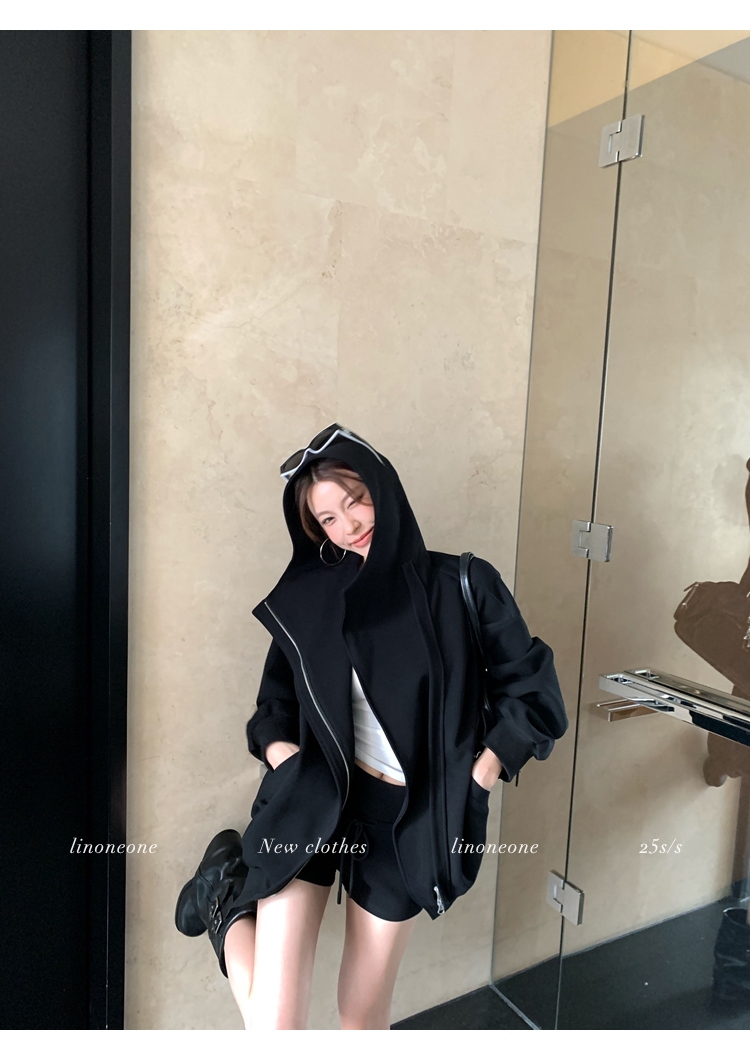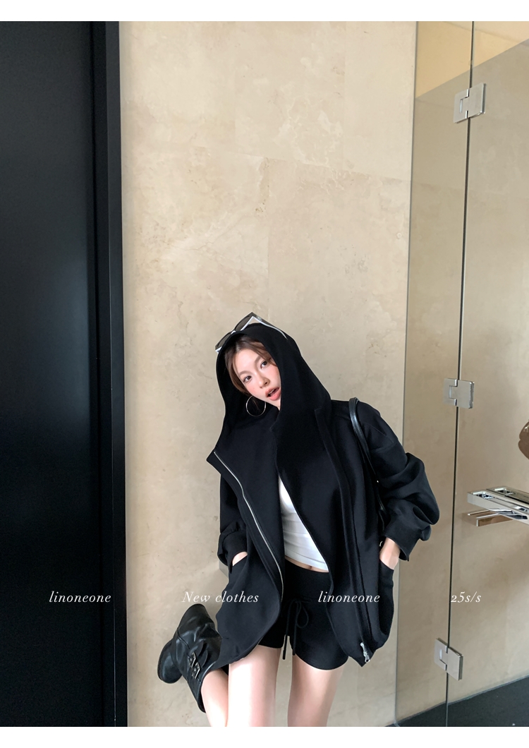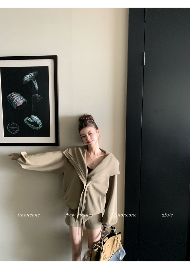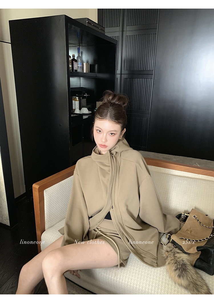 LIN Casual Loose Hooded Sweatshirt Cardigan Jacket Drawstring Shorts Set