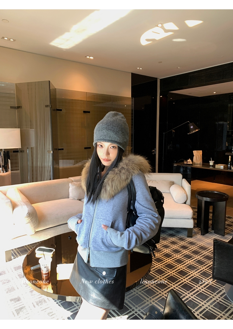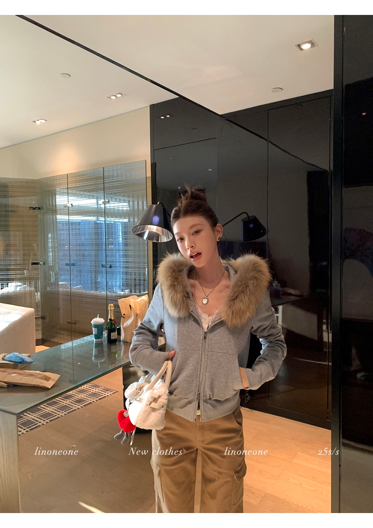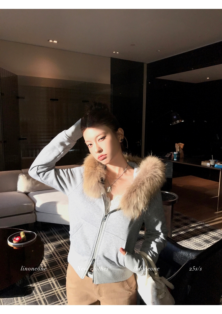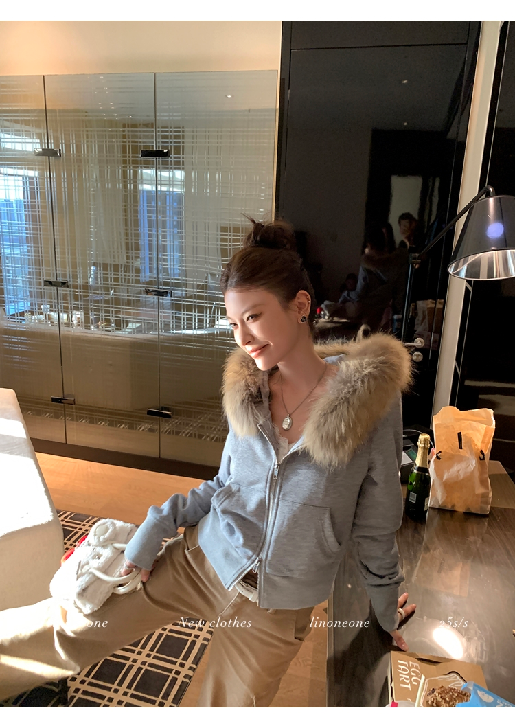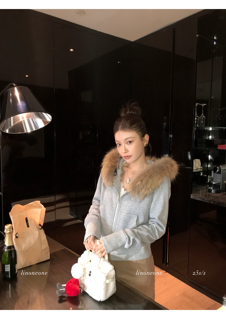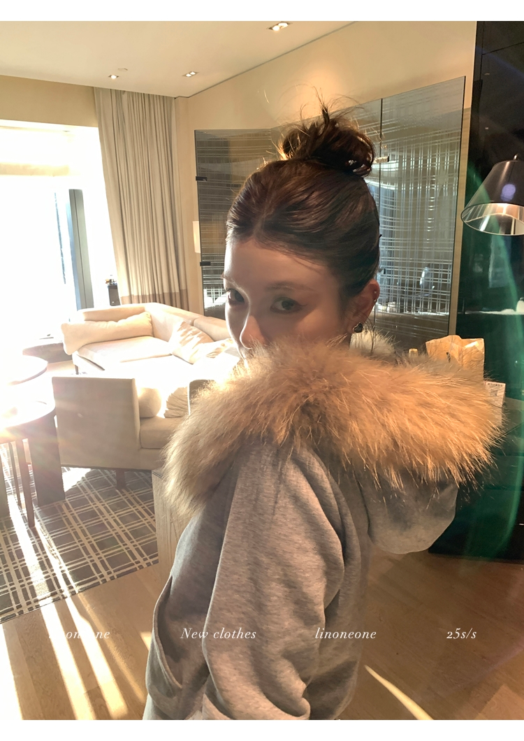LIN Detachable Raccoon Fur Collar Hooded Zip-Up Jacket