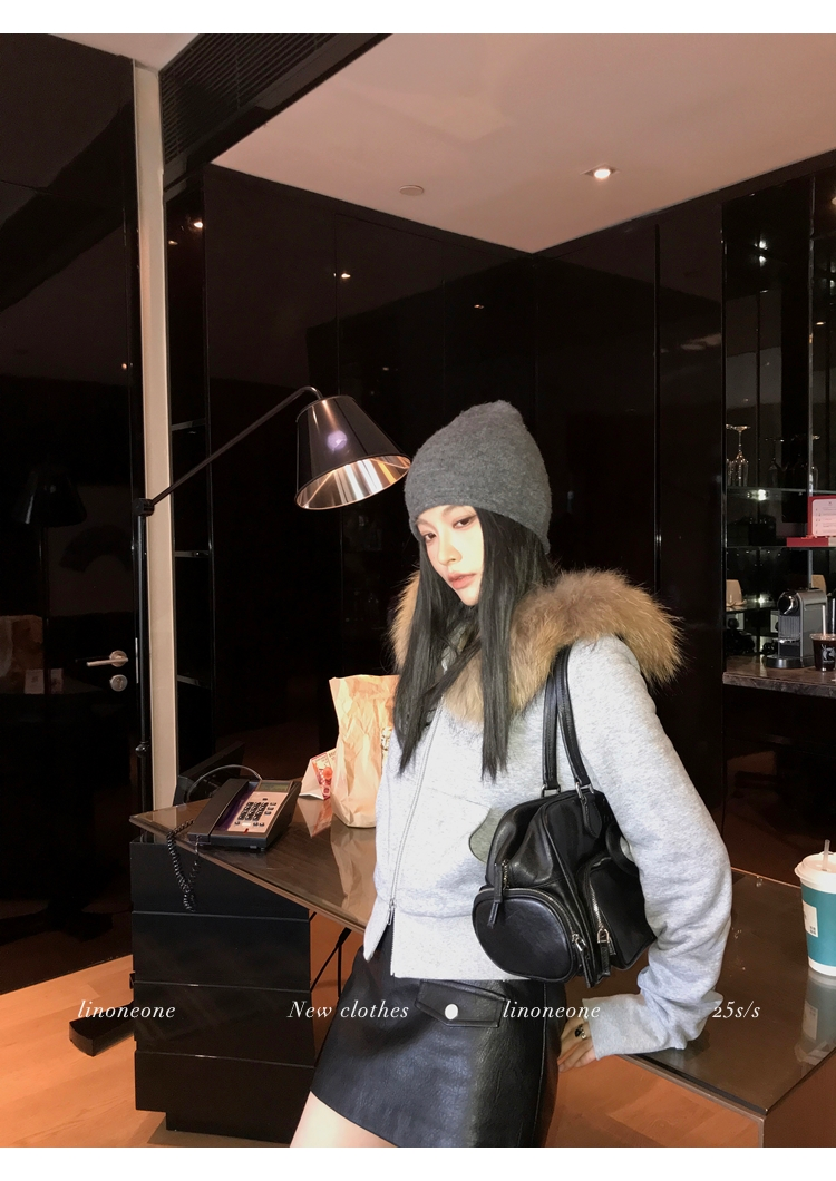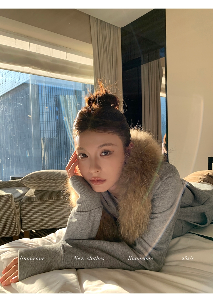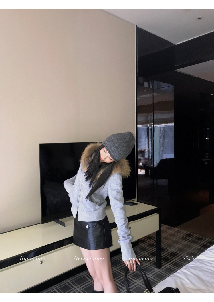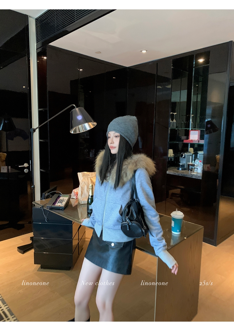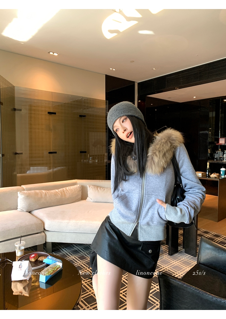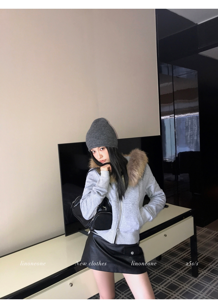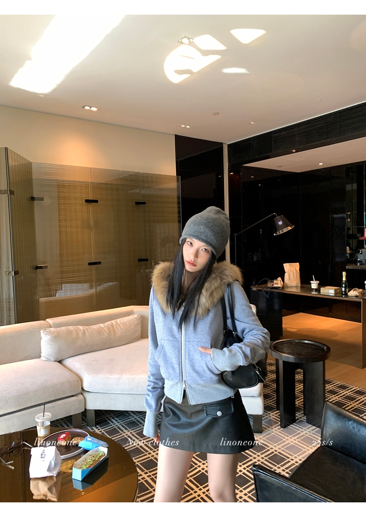 LIN Detachable Raccoon Fur Collar Hooded Zip-Up Jacket