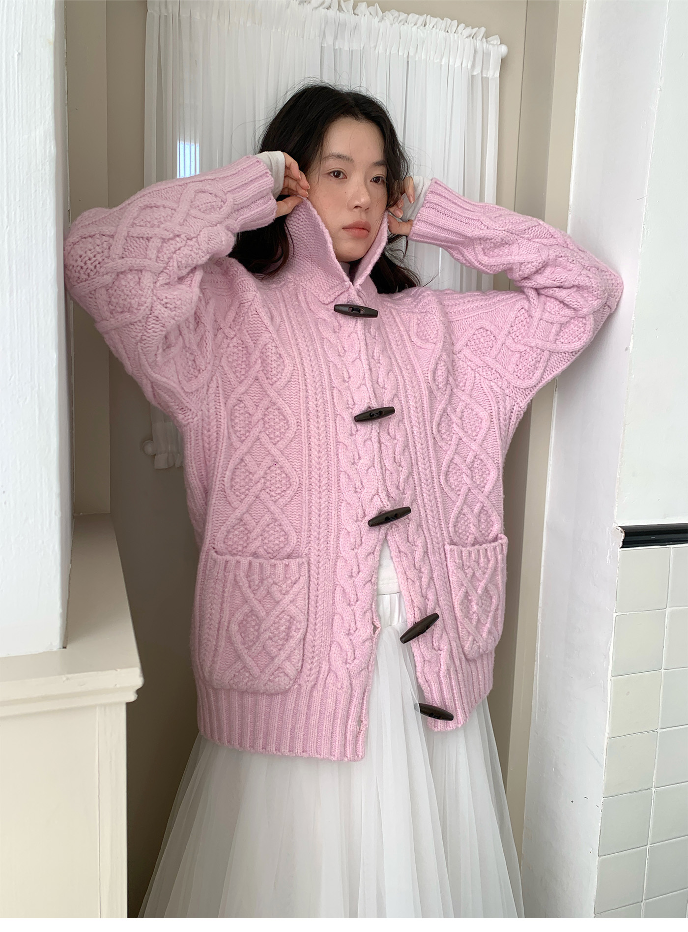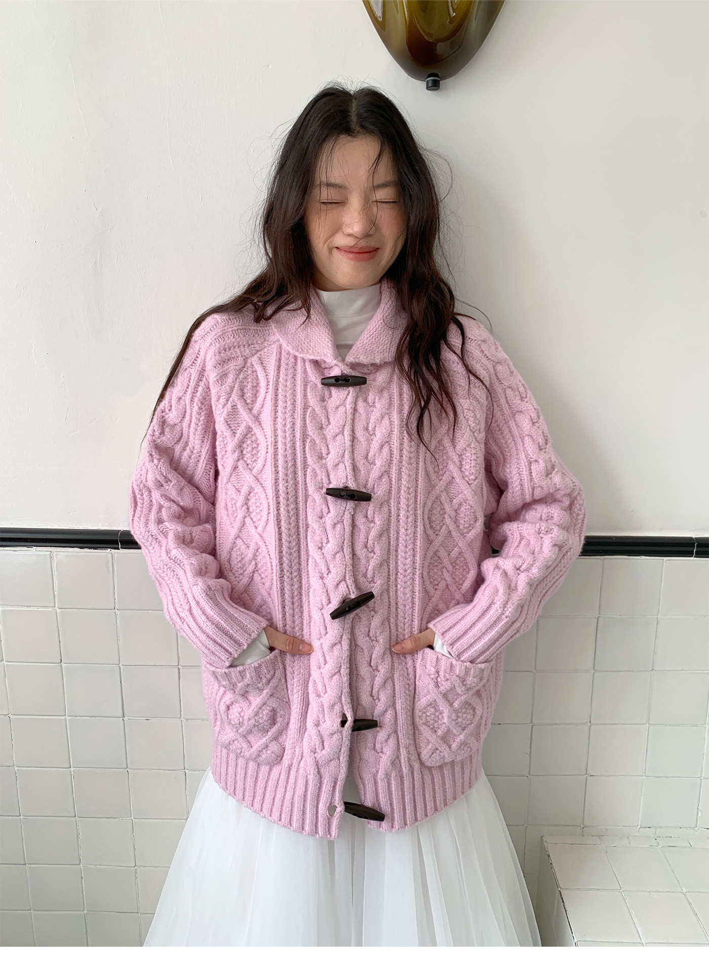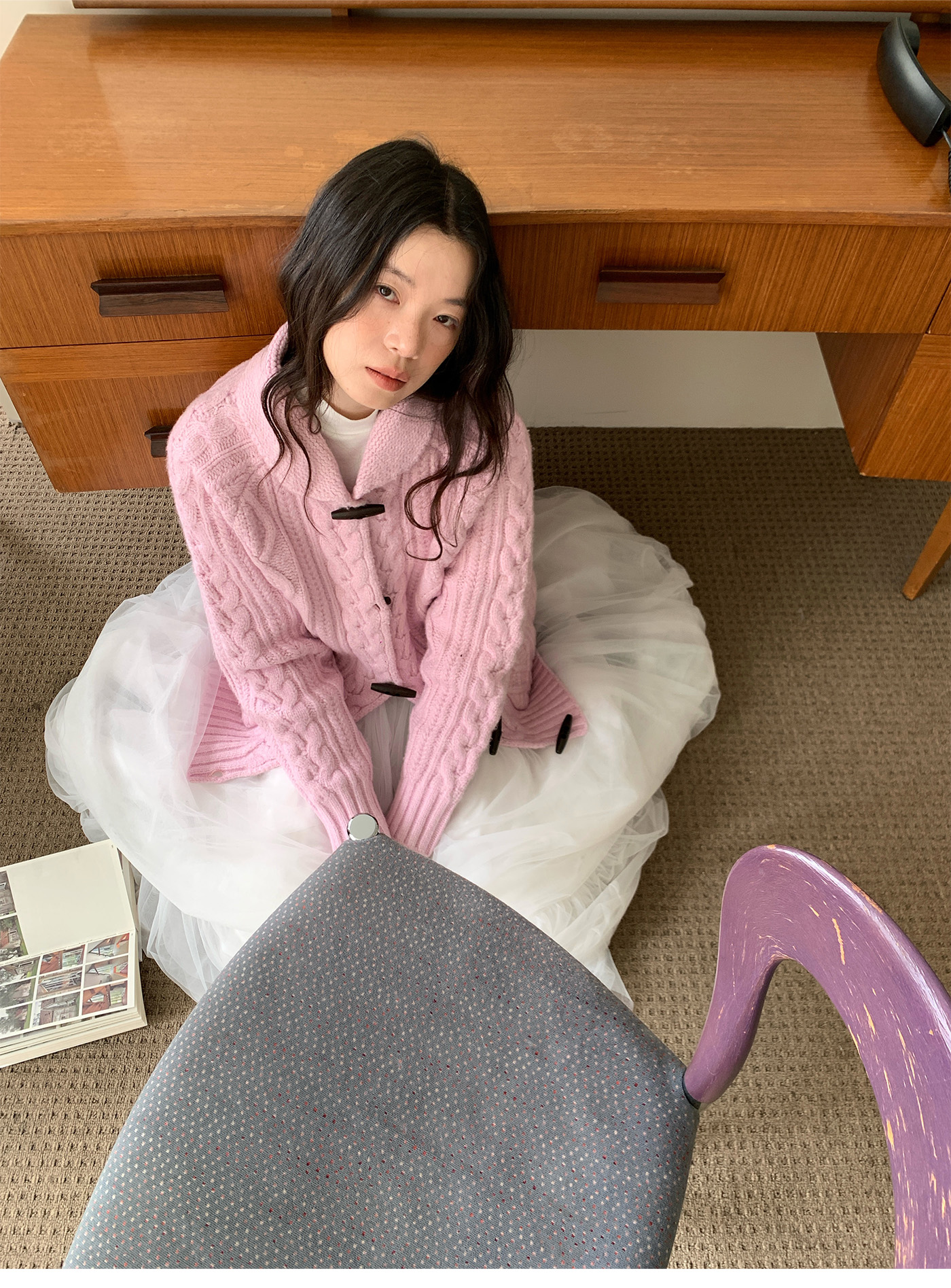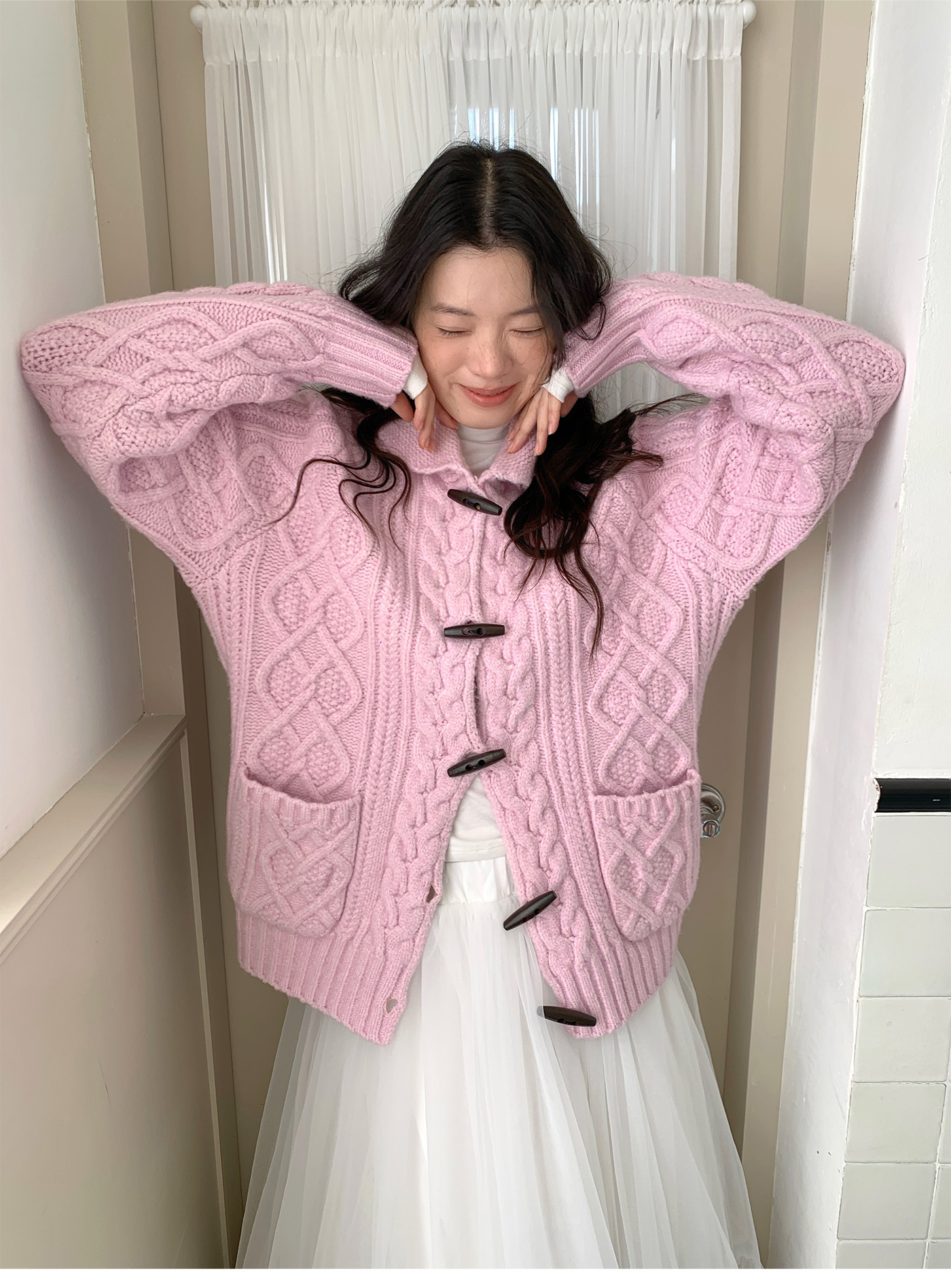 SOO Small Collar Cable Knit Purple Horn Button Sweater Cardigan