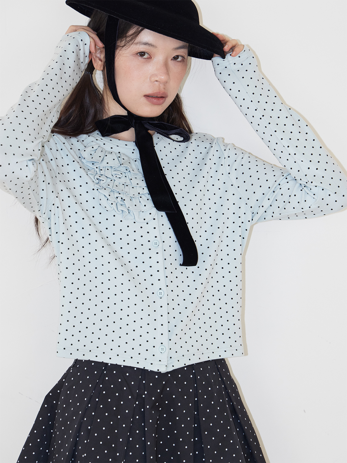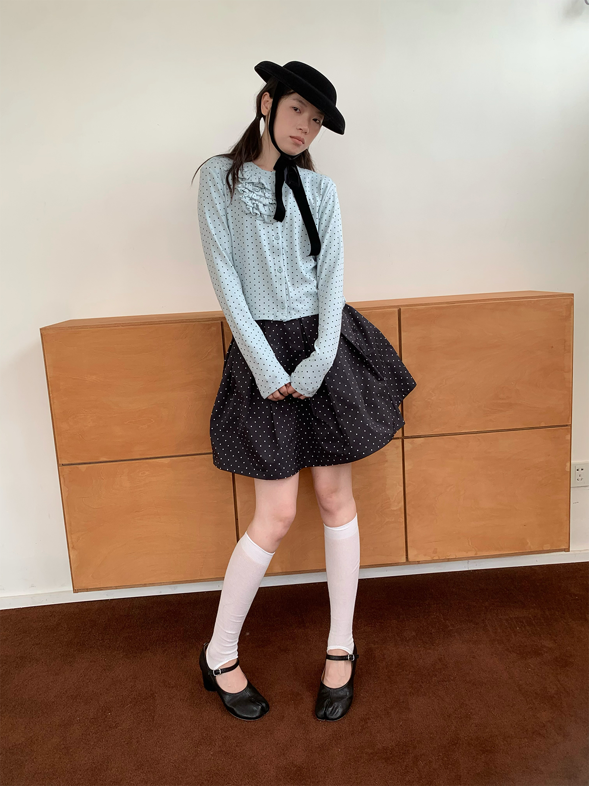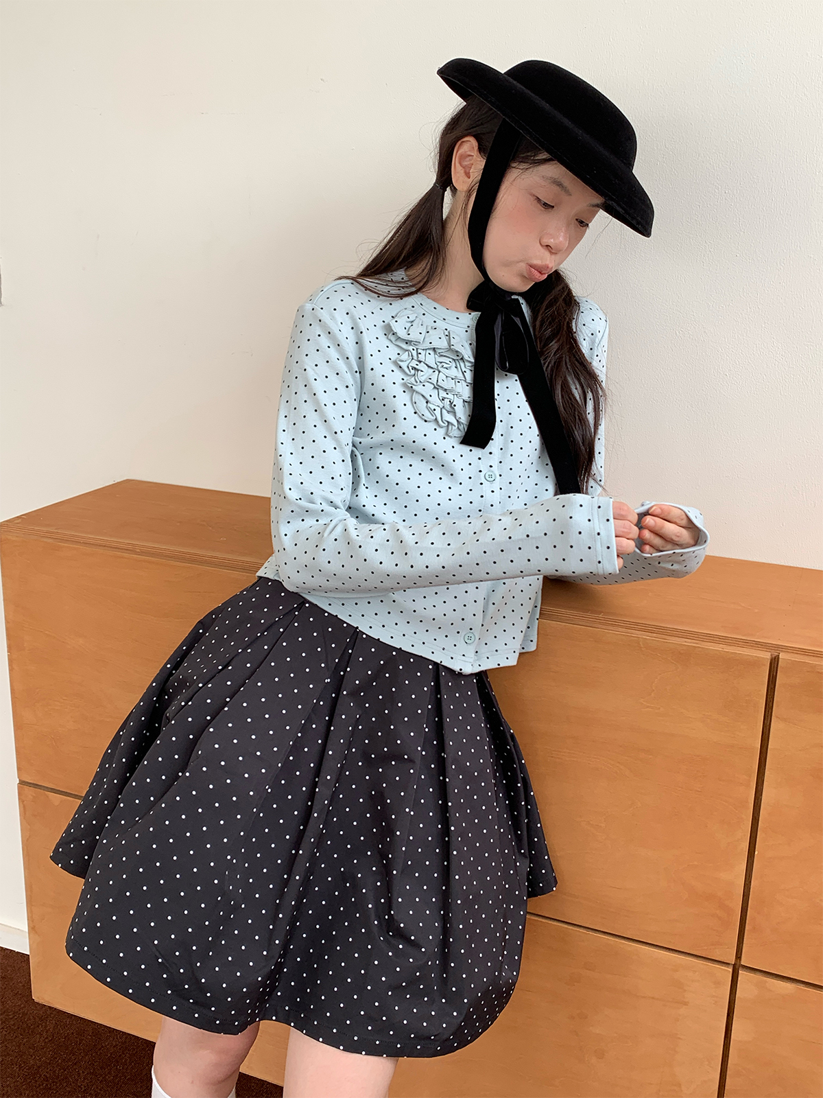 SOO Light Blue Multi-Layer Lace Polka Dot Knit Cardigan