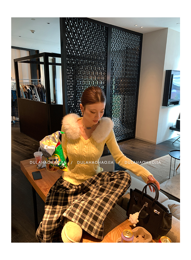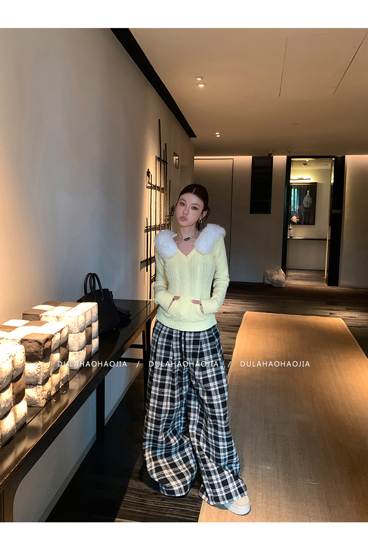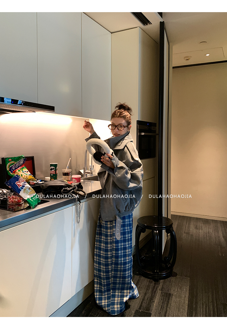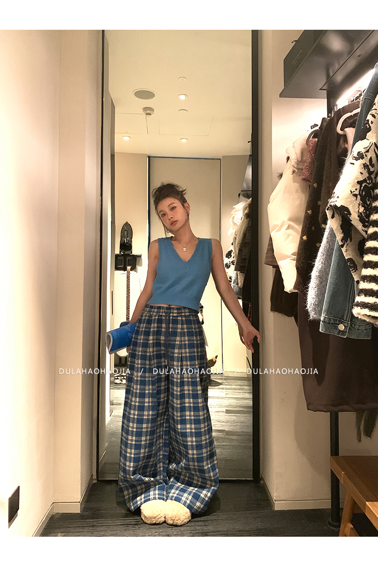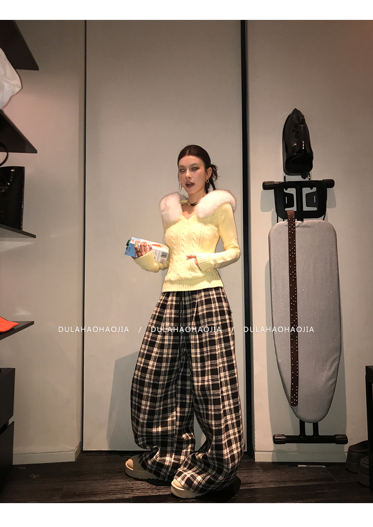 DULA Holiday Wool Plaid Loose Wide-Leg Floor-Length Pants