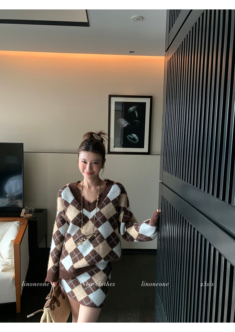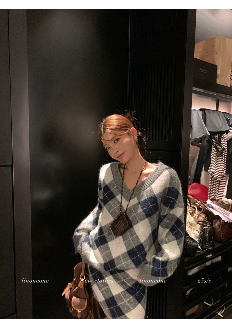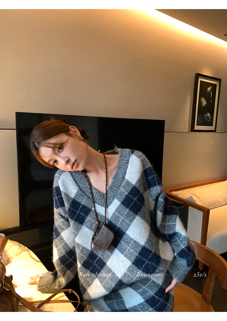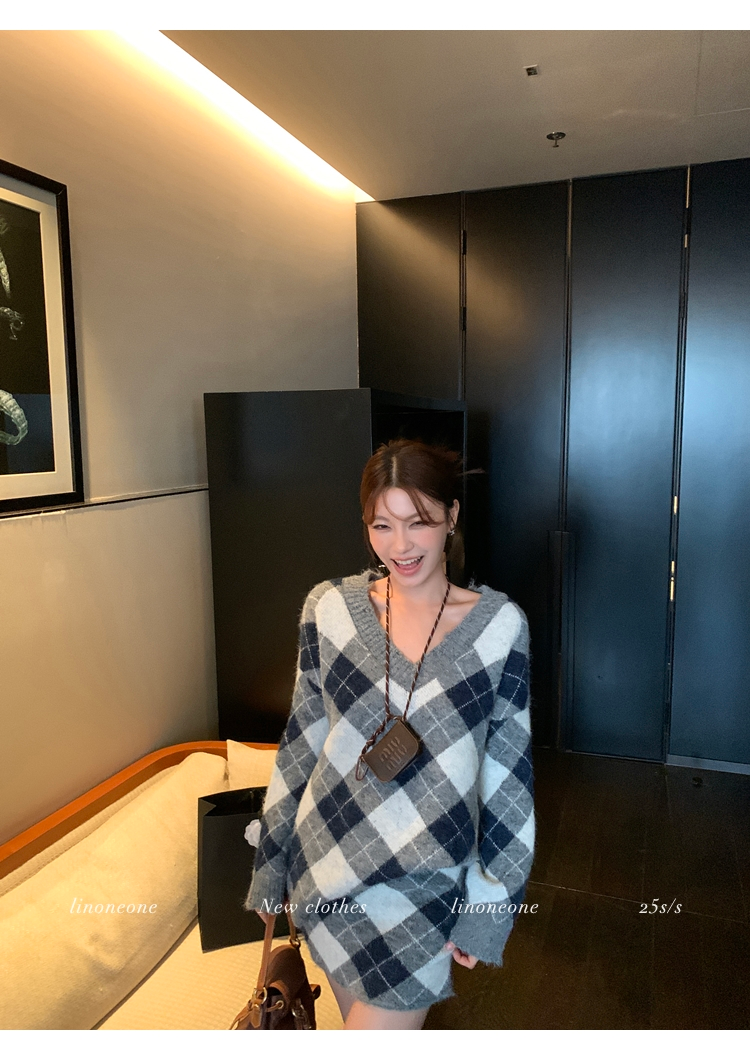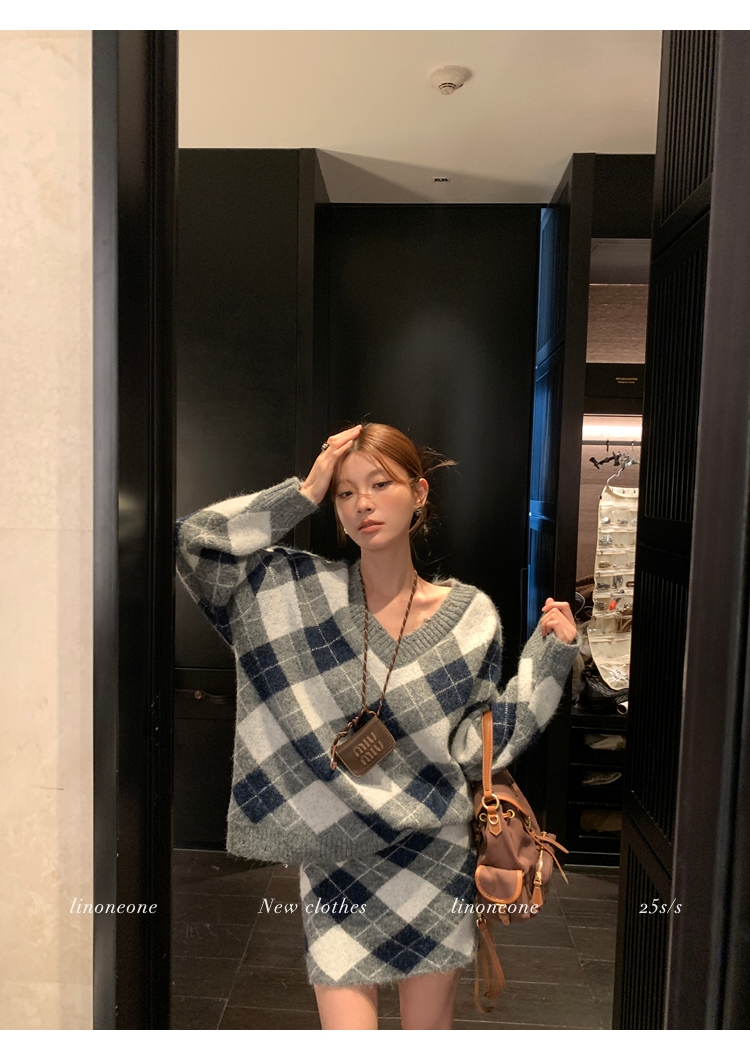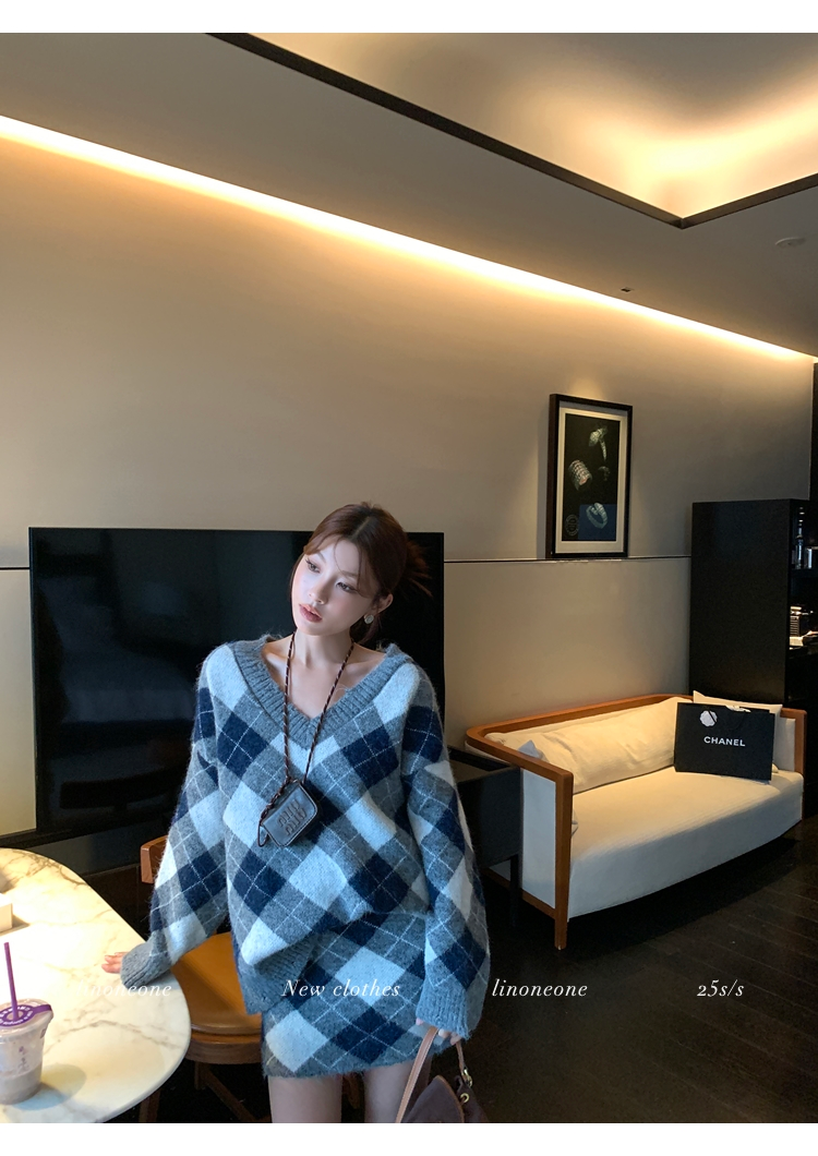LIN V-neck checkered Knit Sweater / Skirt Set