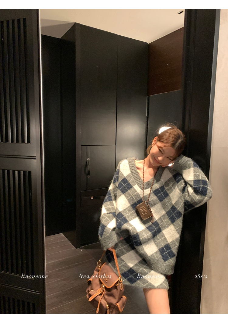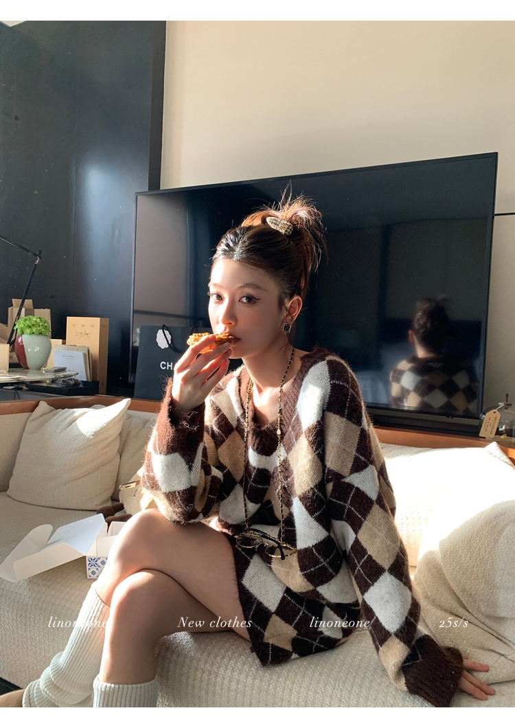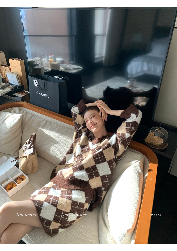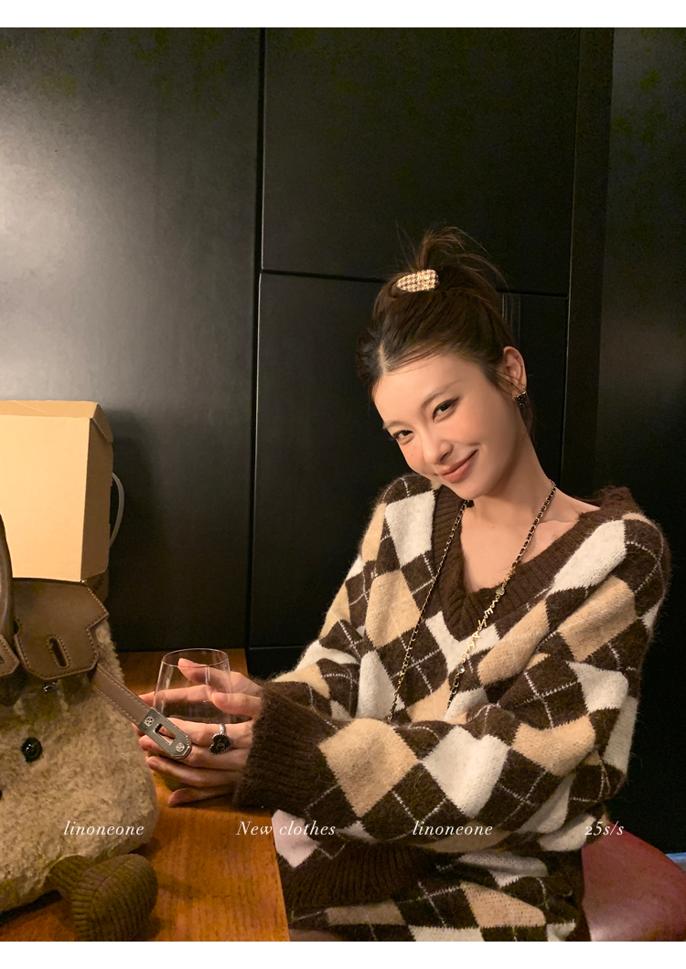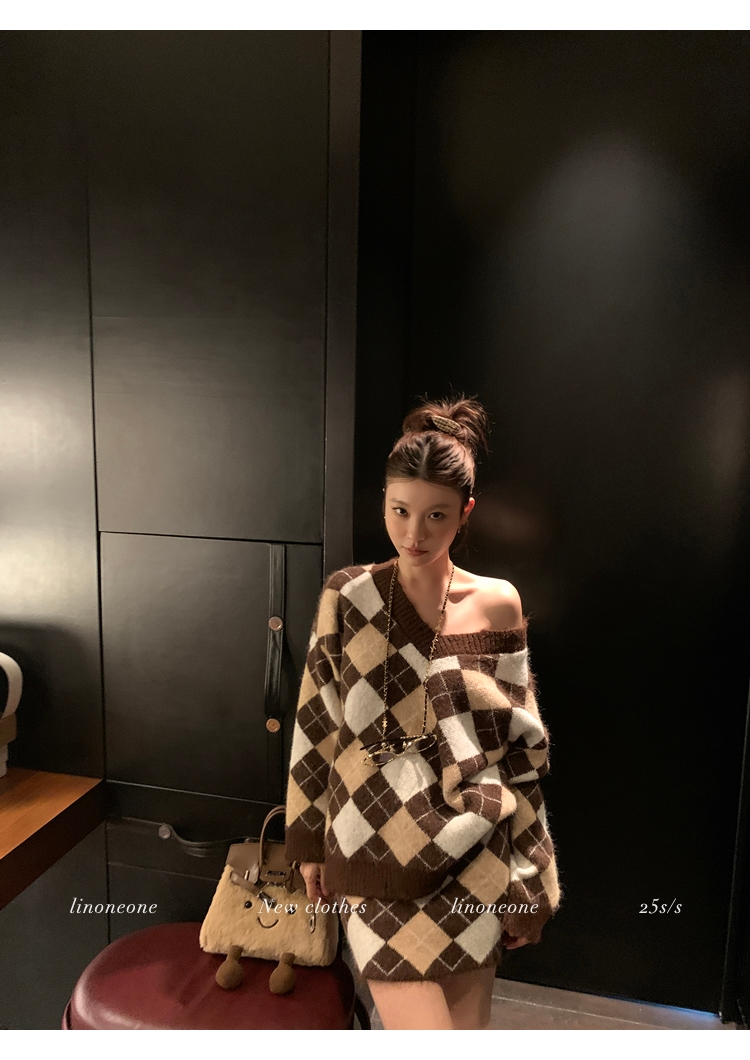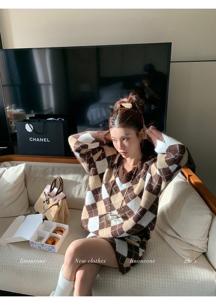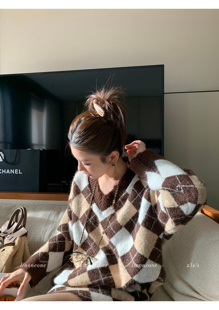 LIN V-neck checkered Knit Sweater / Skirt Set