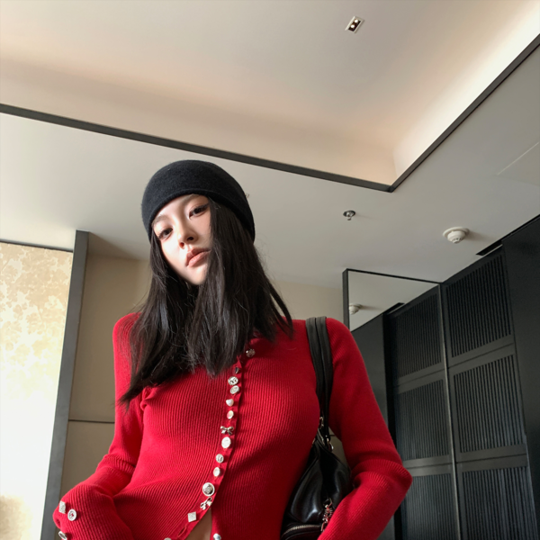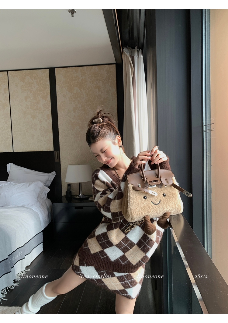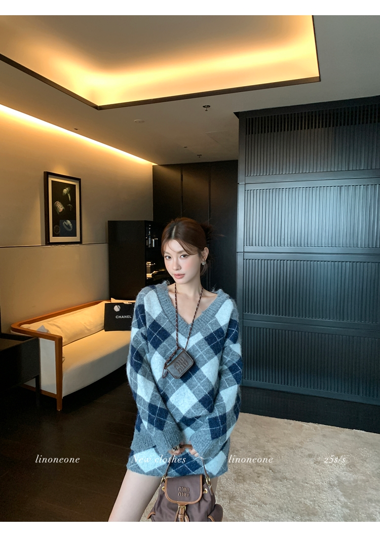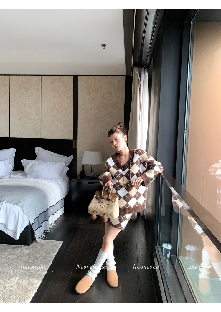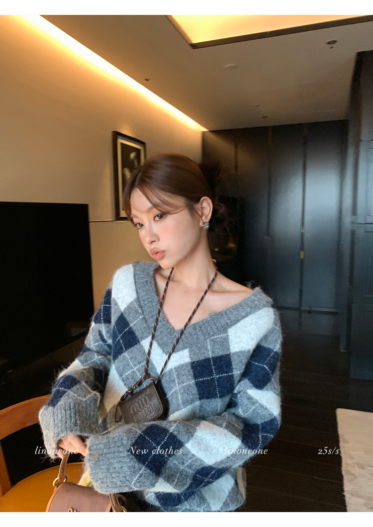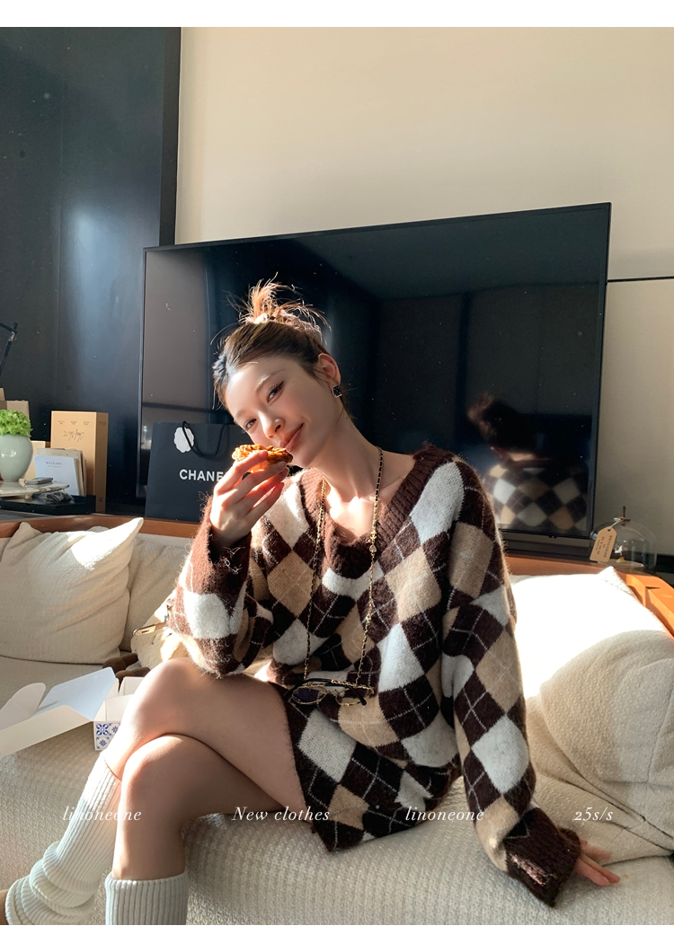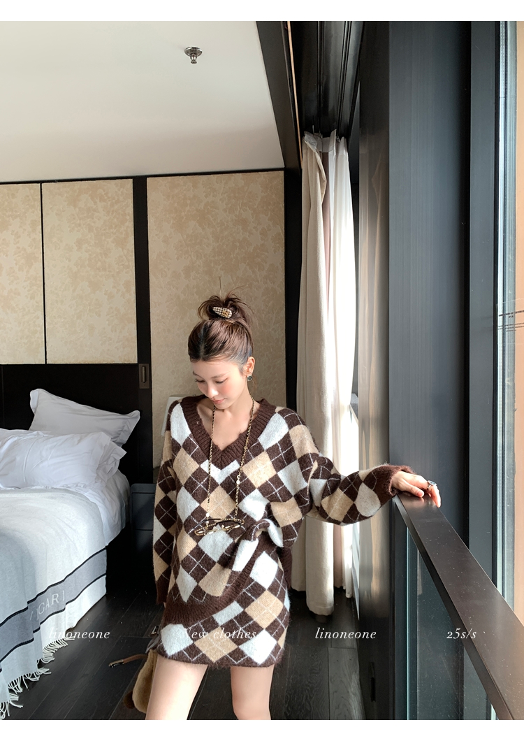 LIN V-neck checkered Knit Sweater / Skirt Set