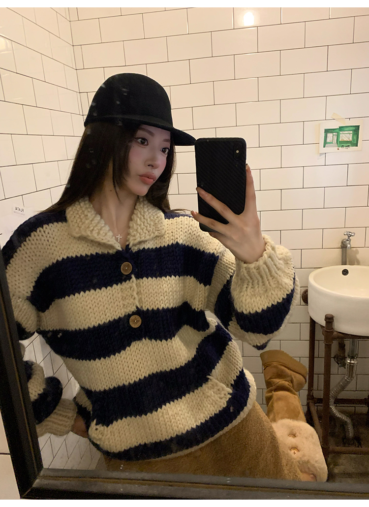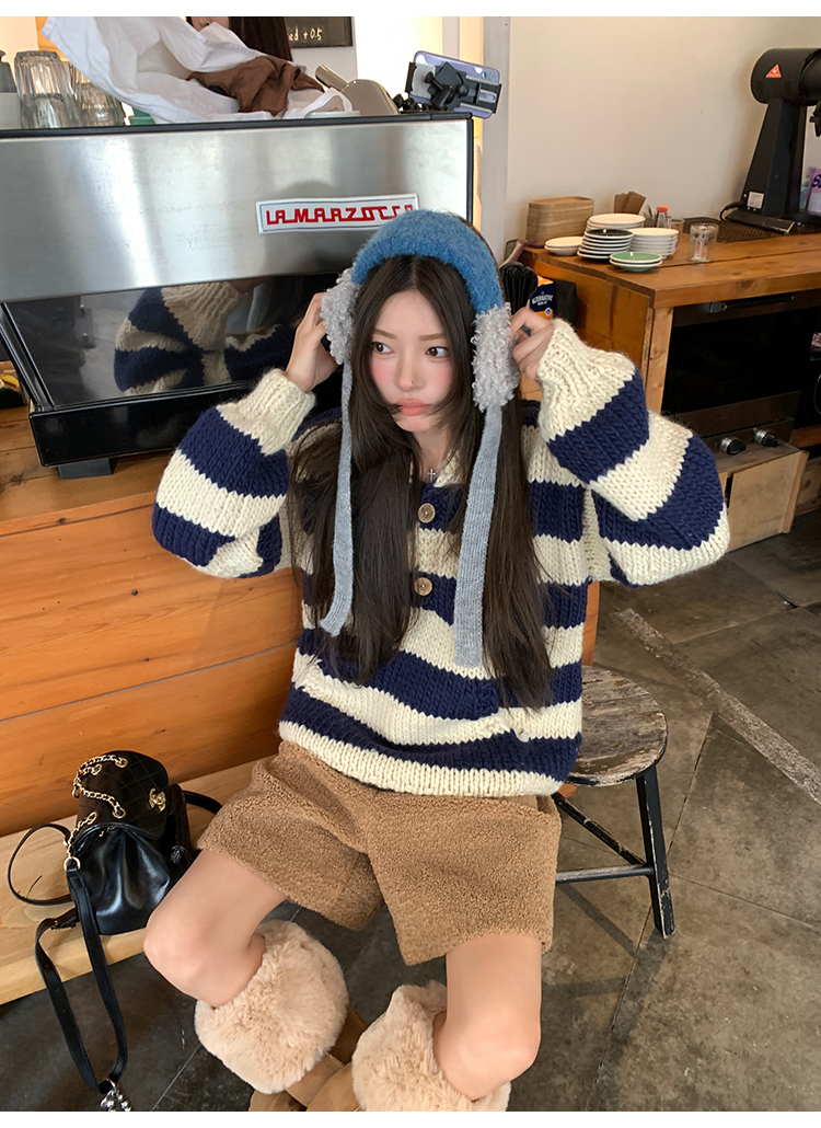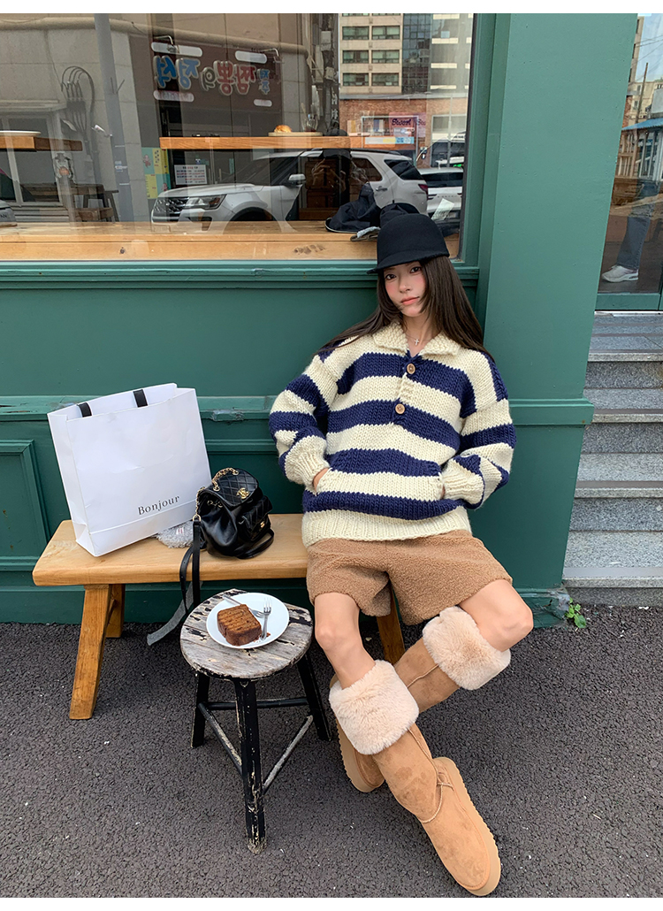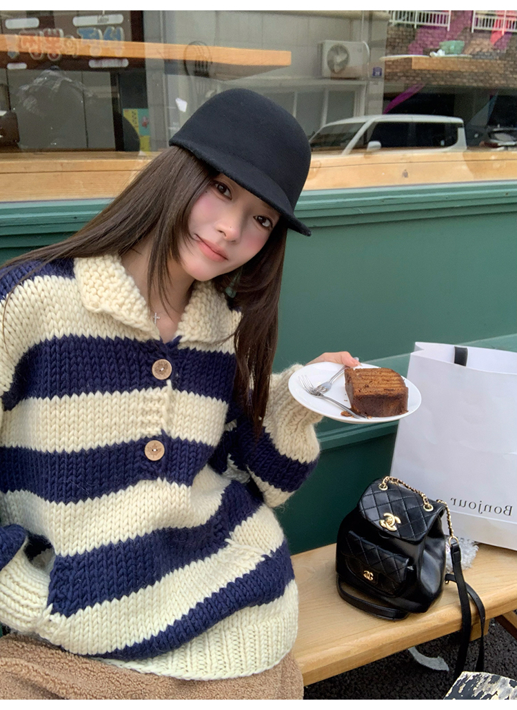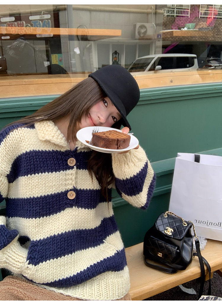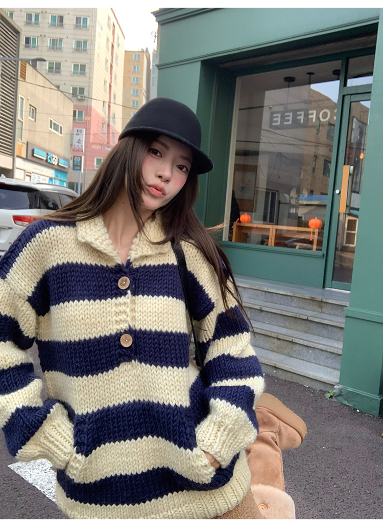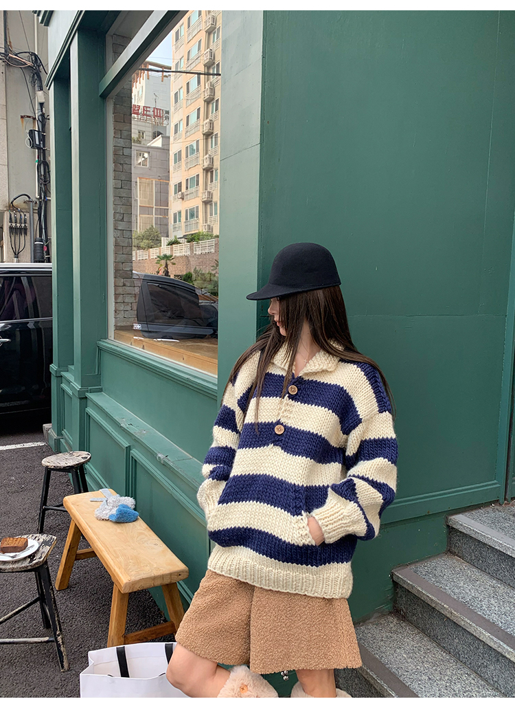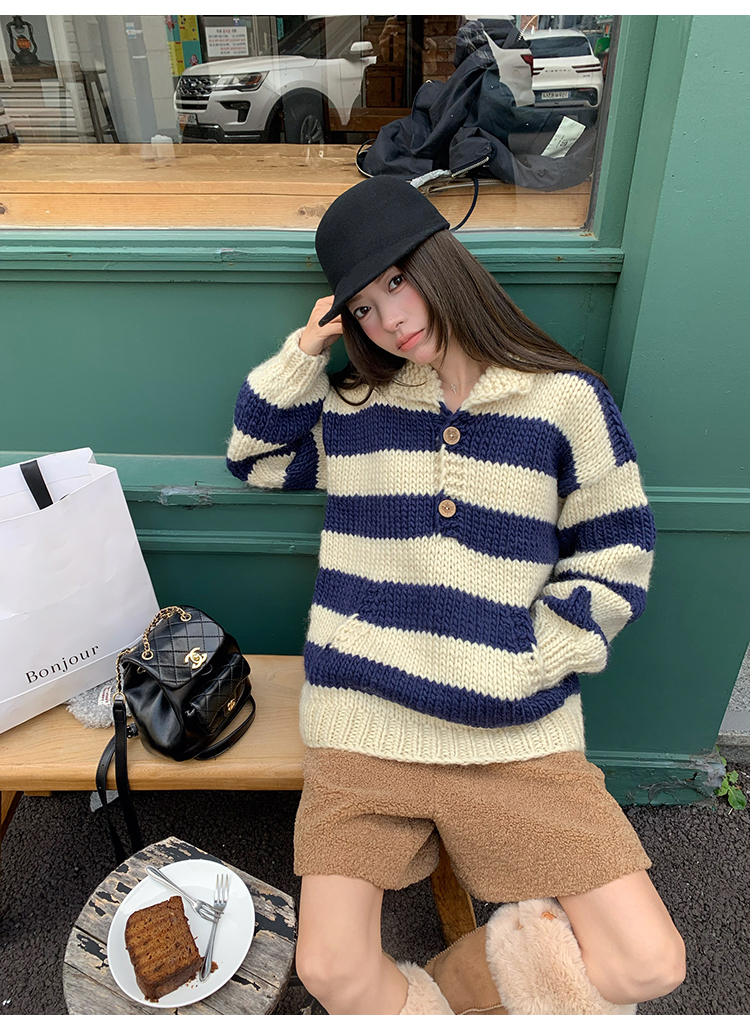 YADA Hand-Painted Striped Polo Collar Knit Sweater