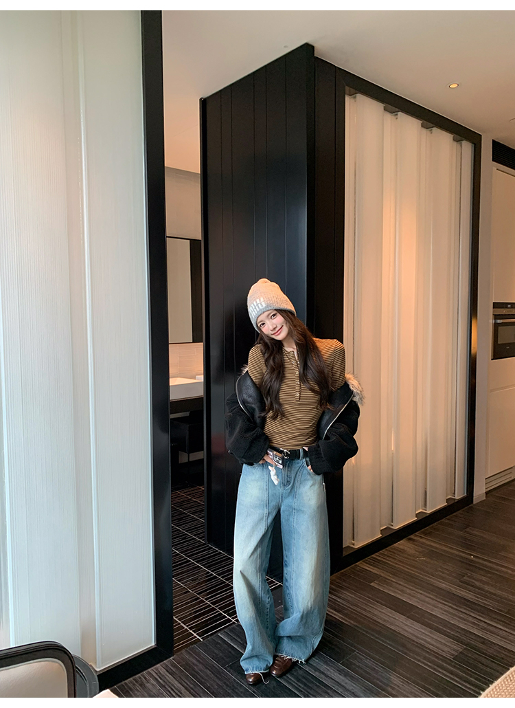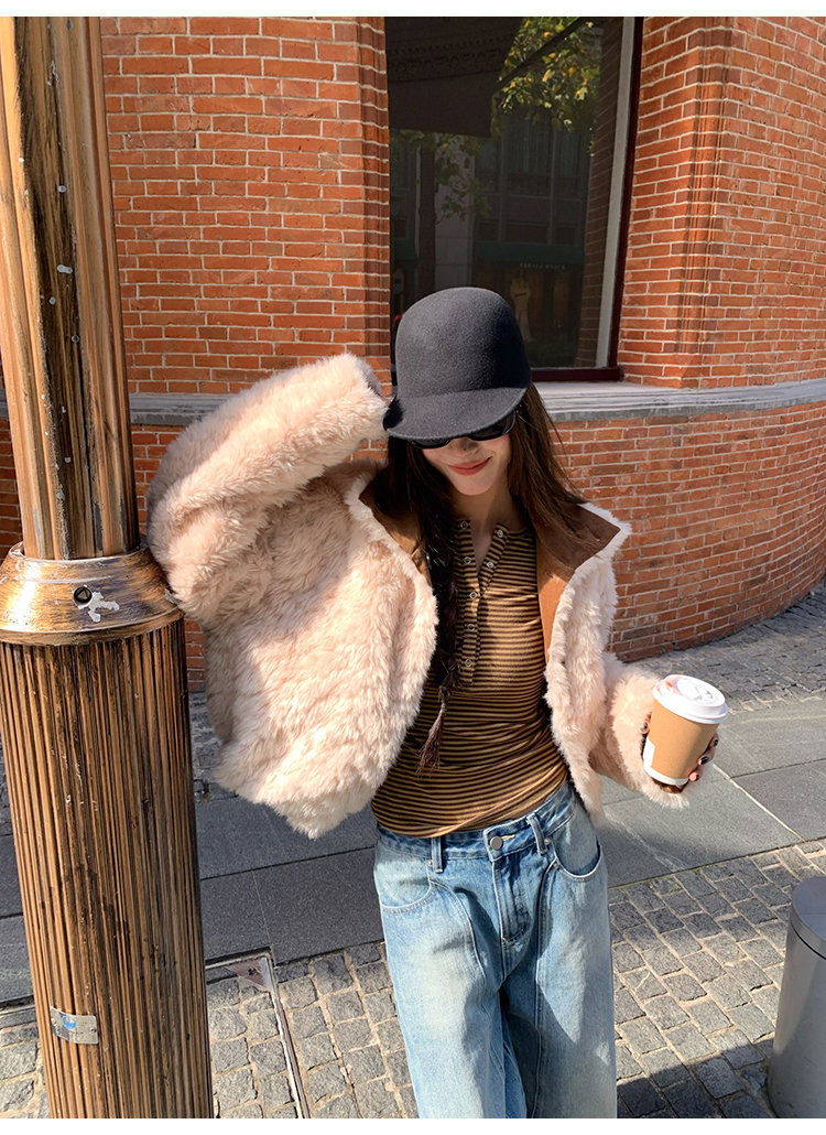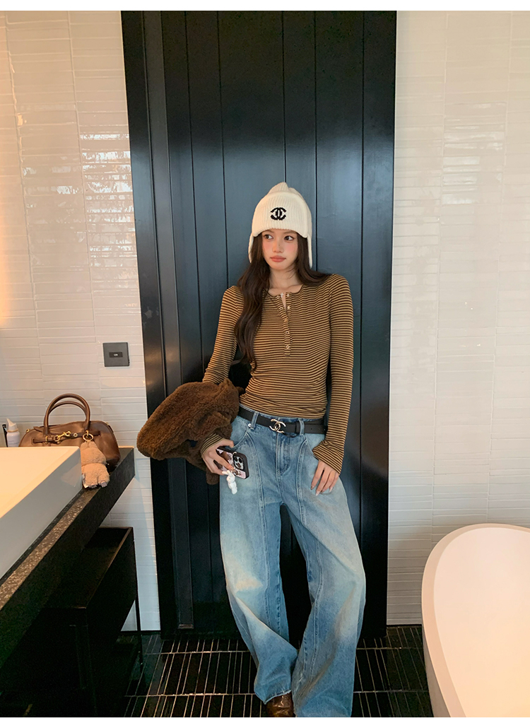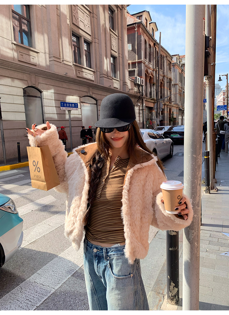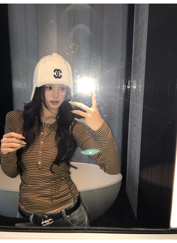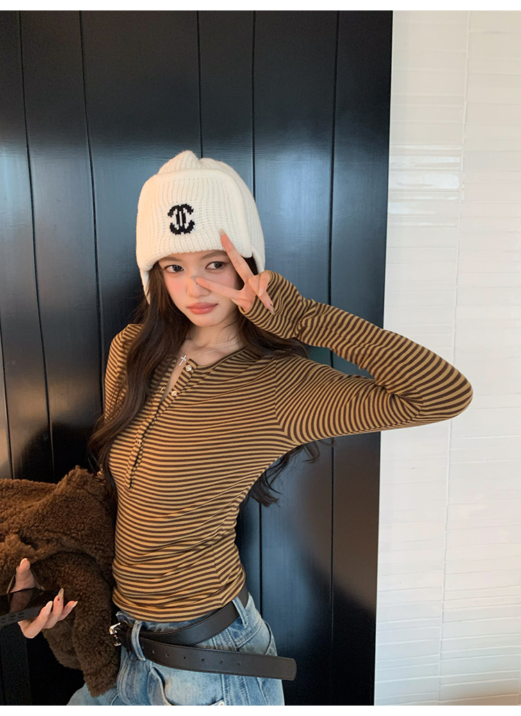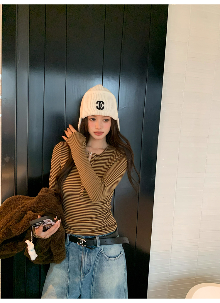 YADA fuzzy texture coffee stripes polo collar T-shirt