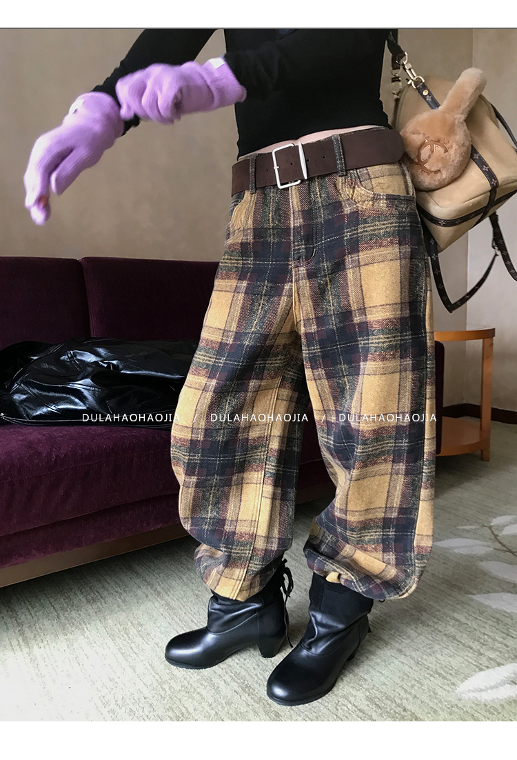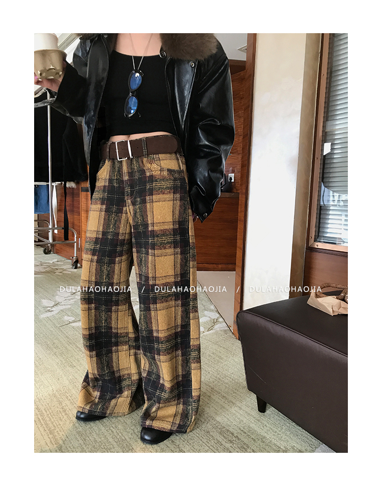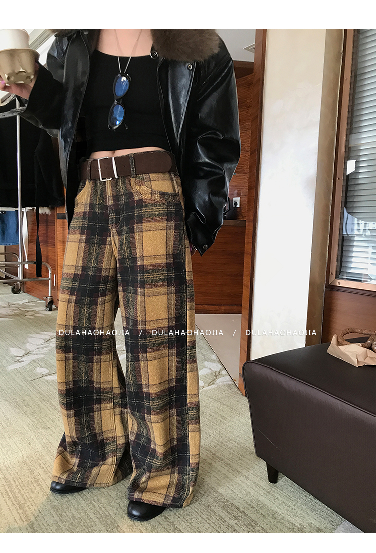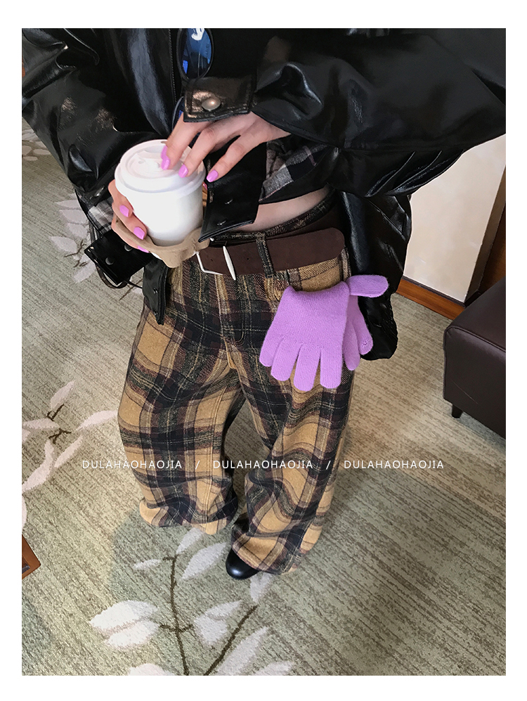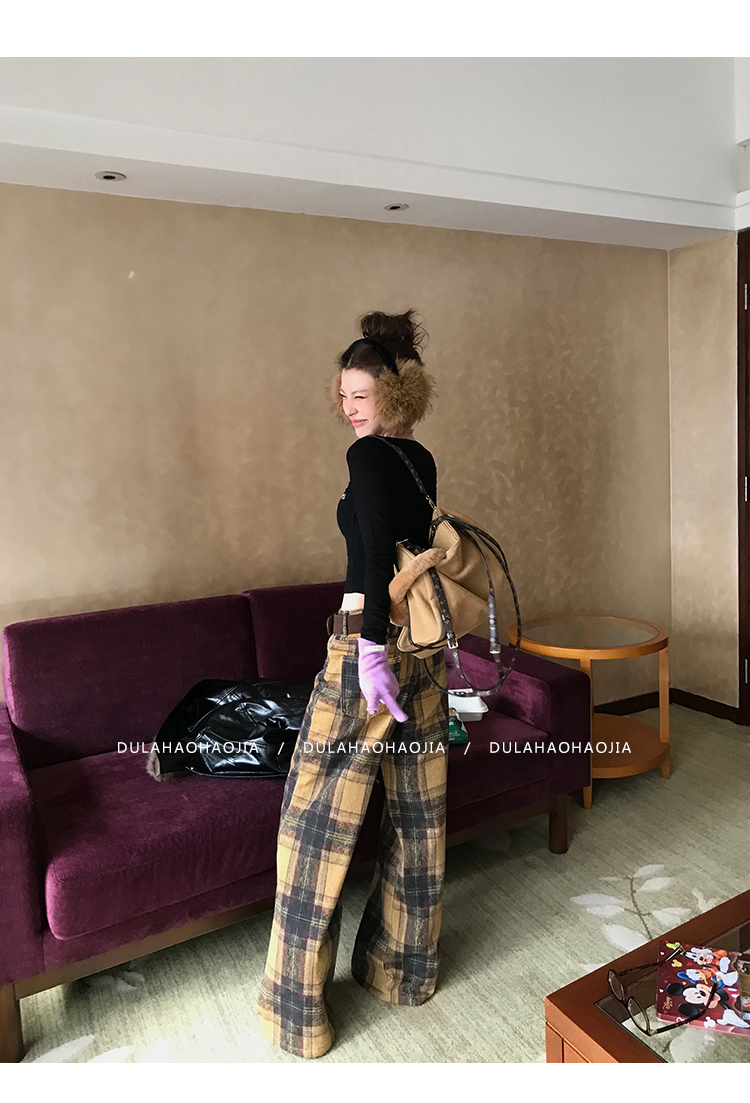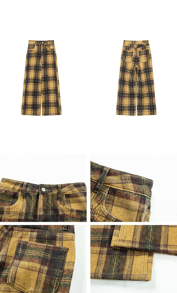 DULA Lazy Relaxation Fleece Yellow Checked Wide Leg Jeans