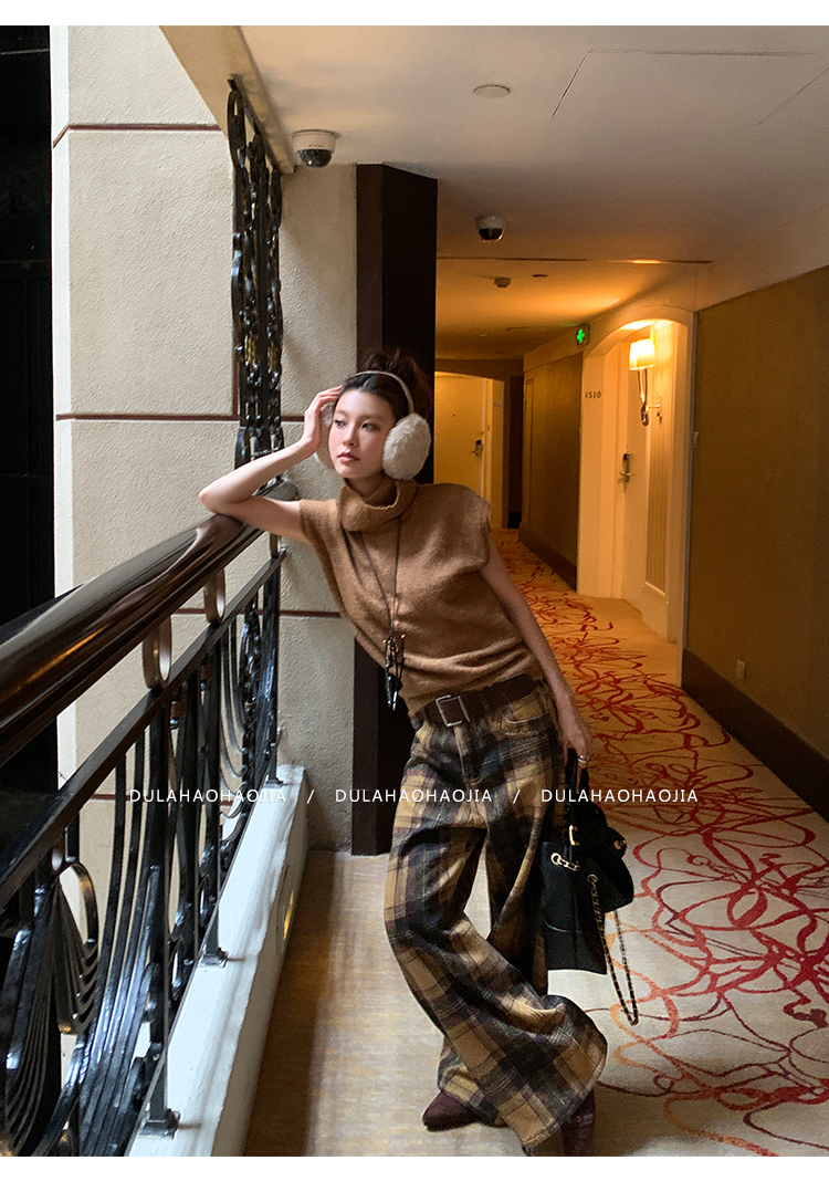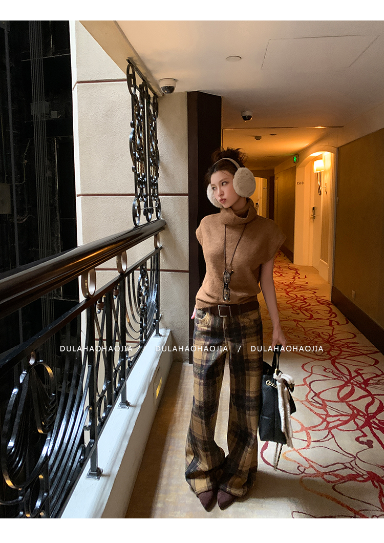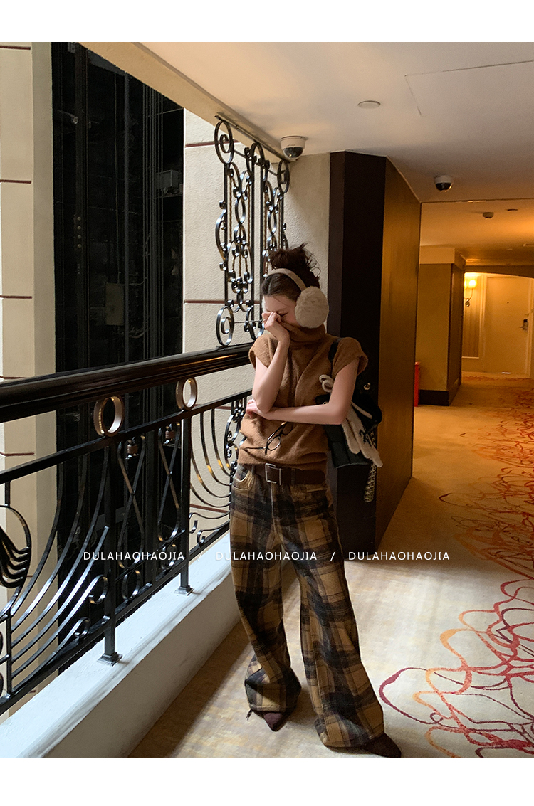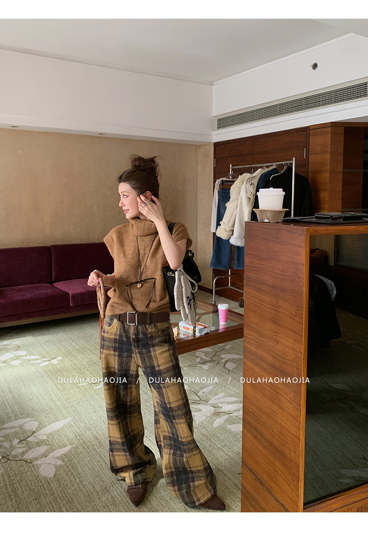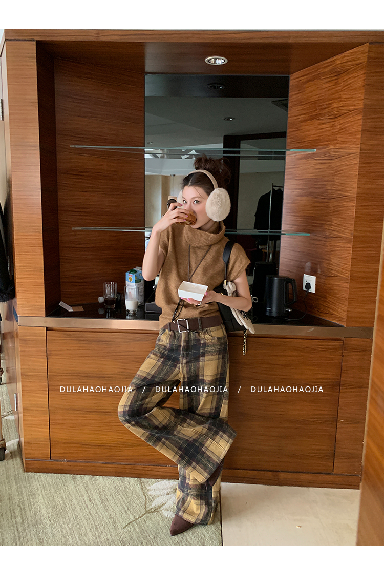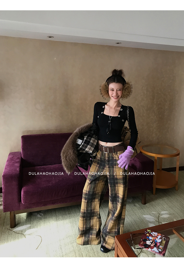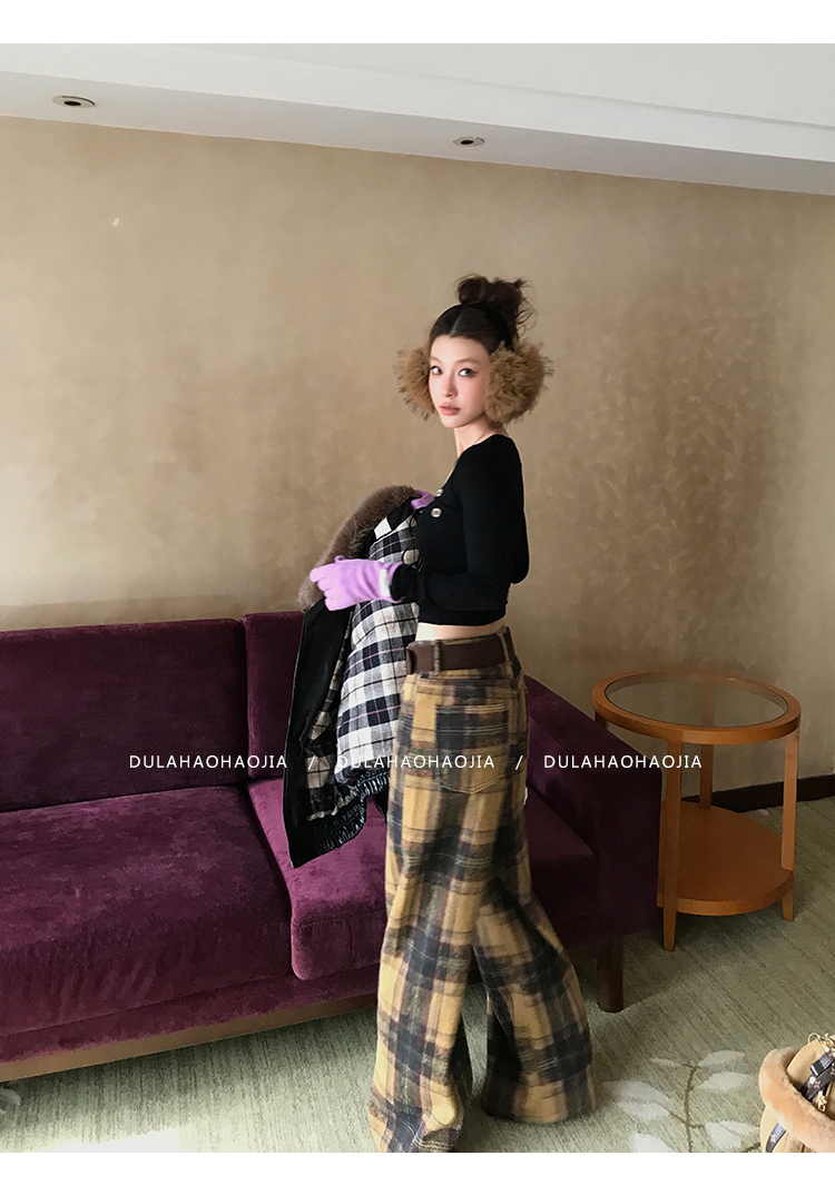 DULA Lazy Relaxation Fleece Yellow Checked Wide Leg Jeans